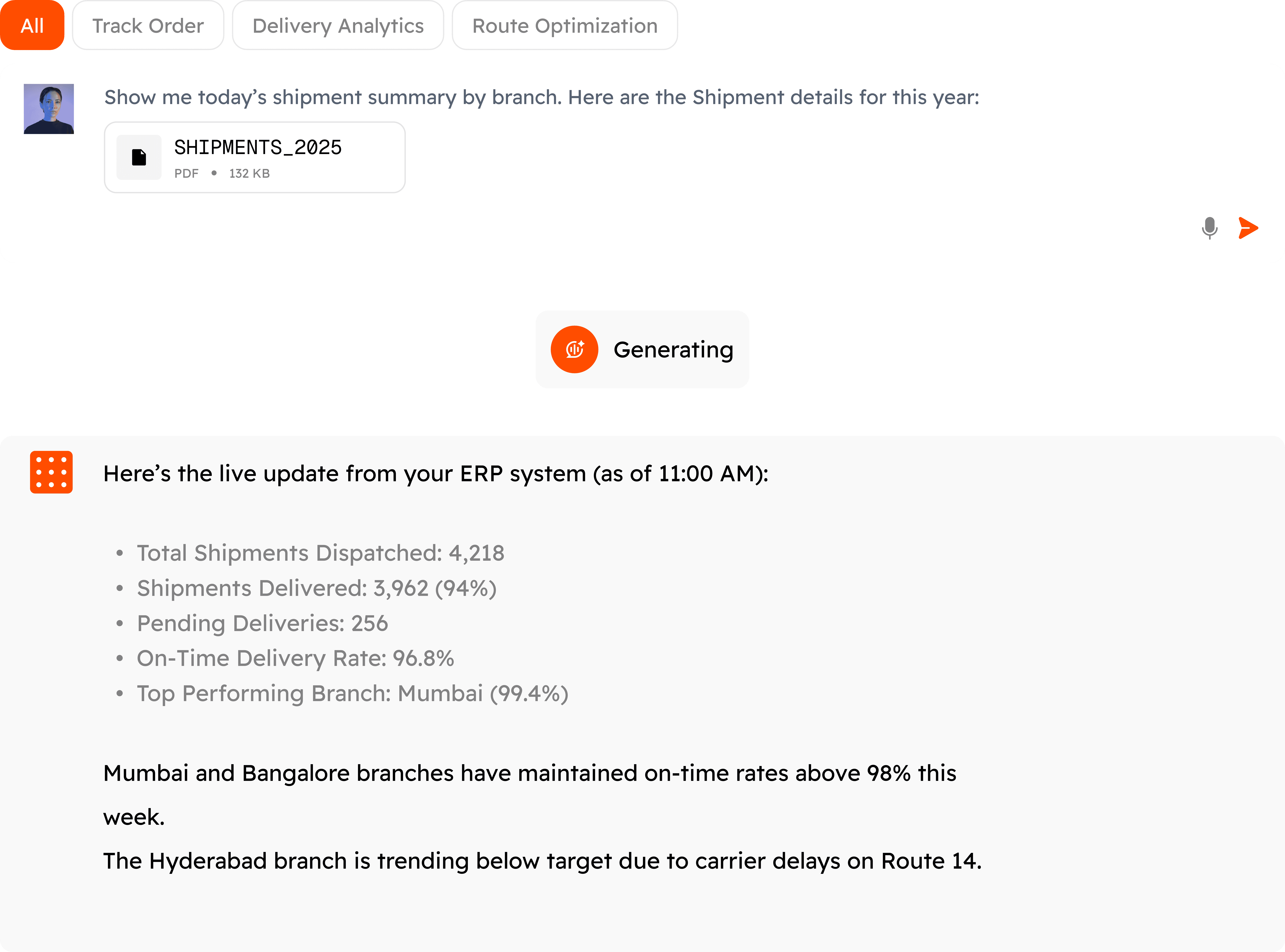 Ask anything about your logistics operations in natural language. I can help you analyze shipments, routes, delivery performance, and more!
